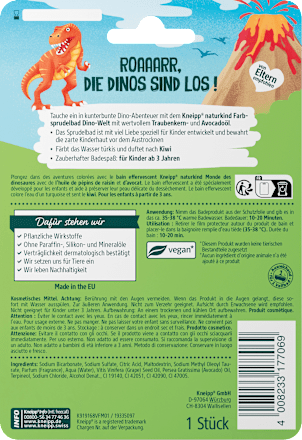 Avontuurlijke badmomenten wachten op u met het Dino Color Bubbelbad van Kneipp Naturkind. Voeg de bruisbal simpelweg toe aan het water en hij verandert in turquoise schuim – als bij toverslag. De formule bevat ook druivenpit- en avocado-olie, die de huid beschermen tegen uitdroging. Een zoete kiwigeur verspreidt zich door de badkamer en maakt de badervaring nog unieker.