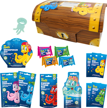 De Tinti Fun Care Treasure Chest biedt spannende producten die voor afwisseling en verrassingen in bad zorgen. Met zorgvuldig geselecteerde ingrediënten verzorgen de Tinti-producten de tere kinderhuid zonder deze aan te raken. Want voor kleine waterratten staat plezier voorop. Met leuke bubbelbaden, knisperend badzout, rollende badparels, leuke badconfetti en kleurrijke badkleuren wordt badderen een creatieve ervaring. De Fun Care Treasure Chest bevat 18 Tinti-producten die de tere kinderhuid verzorgen en tegelijkertijd de ogen van kinderen laten stralen.